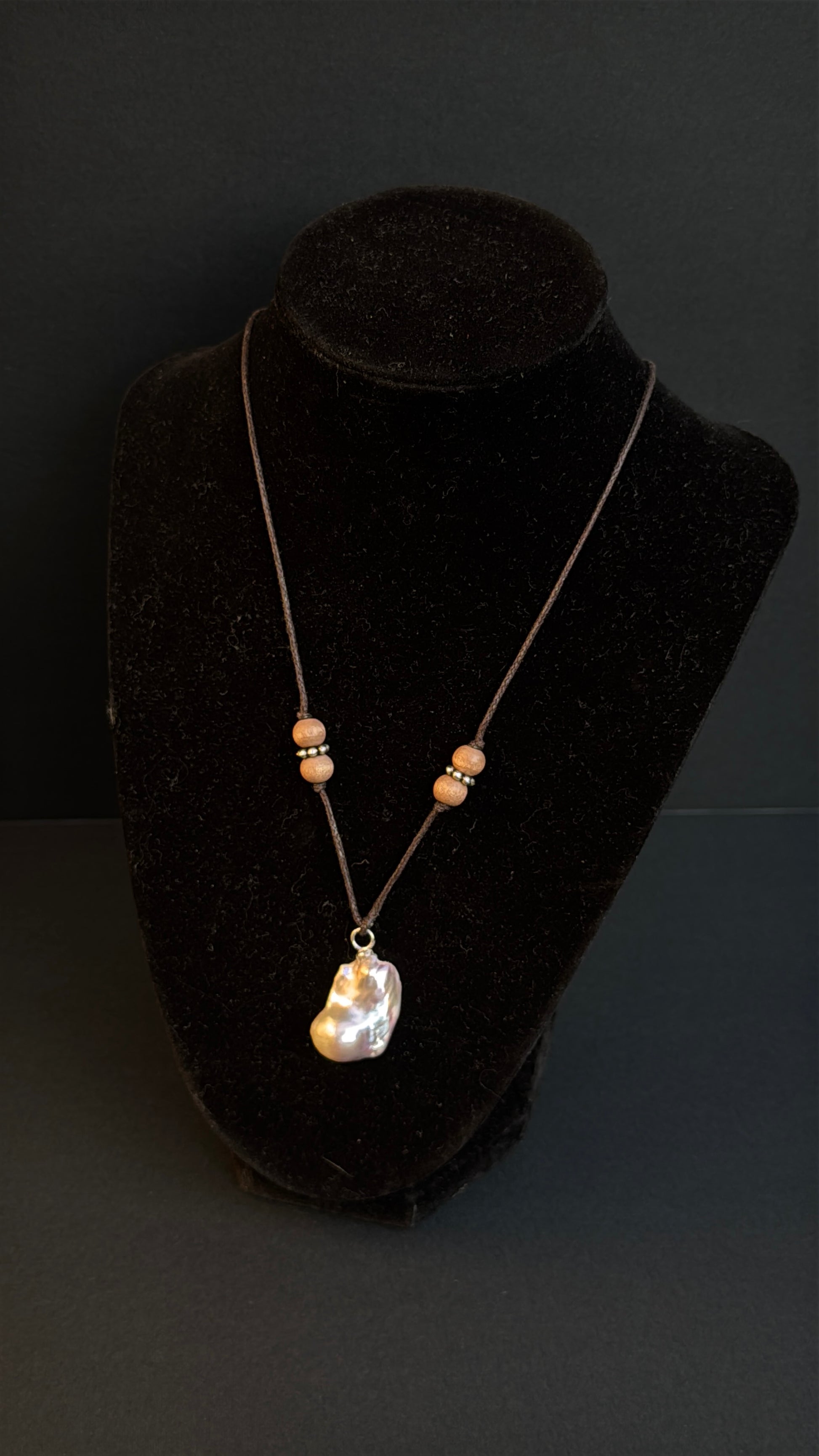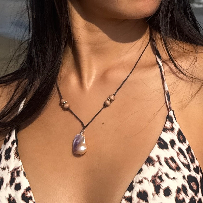 Inspired by sunrise tones and the optimism of a new day, this necklace features a natural baroque pearl centerpiece, flanked by two wooden beads and silver charms on brown cotton cord. Easy, effortless, and perfect for the beach, a bikini, or a sundress.