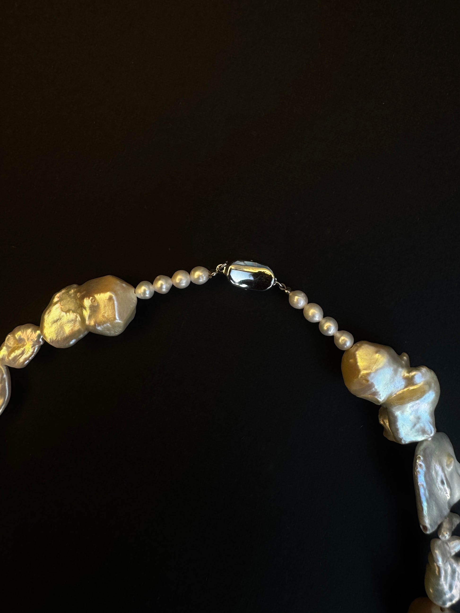 Inspired by the glow and shifting hues of Newport Beach’s golden hour skies, this 16-inch piece features natural pink, white, and sand colored baroque pearls, each uniquely shaped like the houses along the pier. A reflection of light, color, and the beauty of fleeting moments. Perfect to wear alone or style as a set.