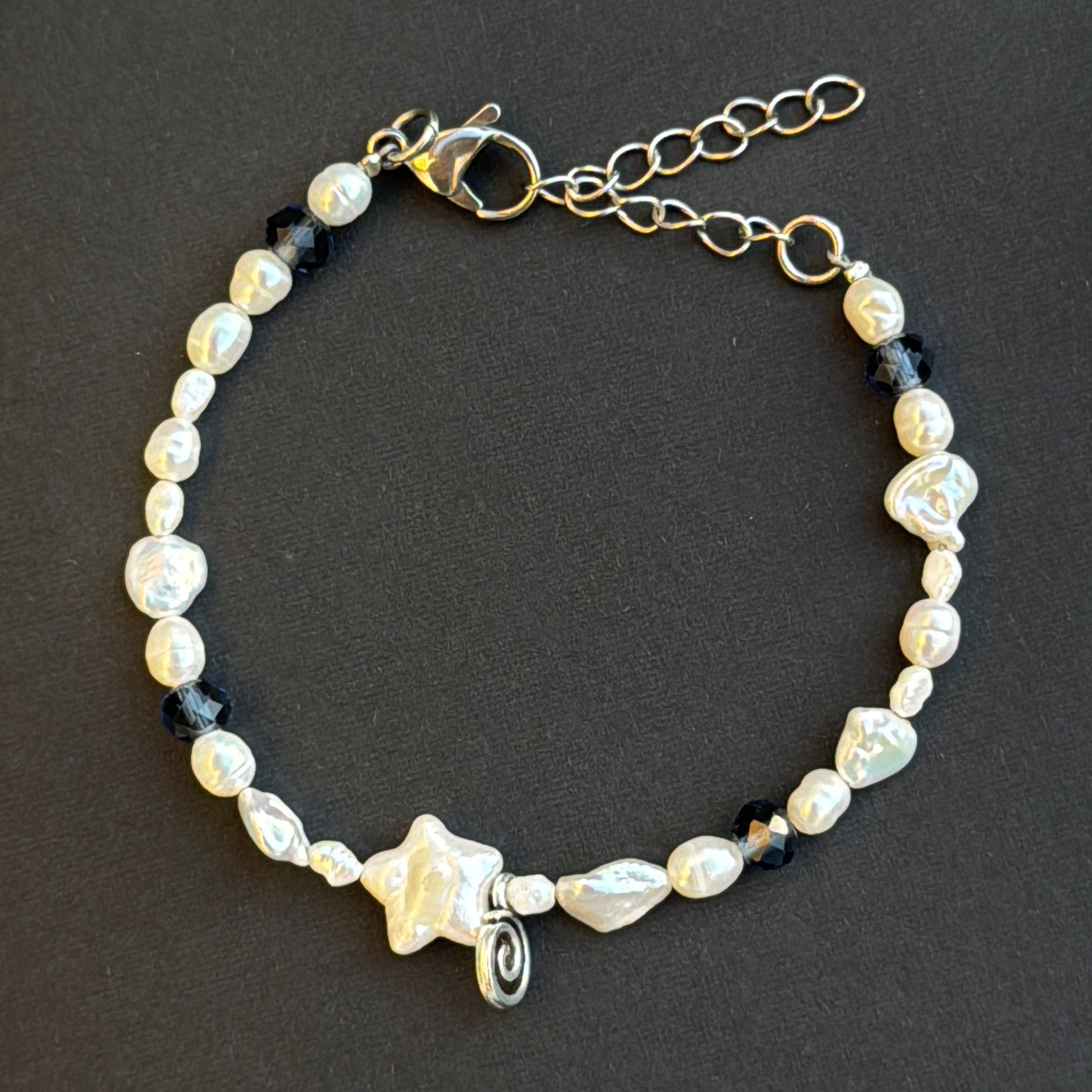 The last piece in the 4ever Jewelry Collection, this bracelet is inspired by the midnight sky and stars over the Pacific coast. It features alternating small freshwater round pearls, baroque pearls, and navy crystal beads. At the center is a star-shaped baroque pearl with a silver spiral charm, a Stars4ever signature. Finished with a sterling silver clasp and adjustable chain, it’s designed for effortless, everyday wear.